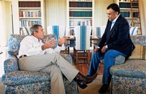 The Bush family and Saud family are longtime friends. Here, Prince Bandar visits with George W. Image courtesy of Mother Jones.